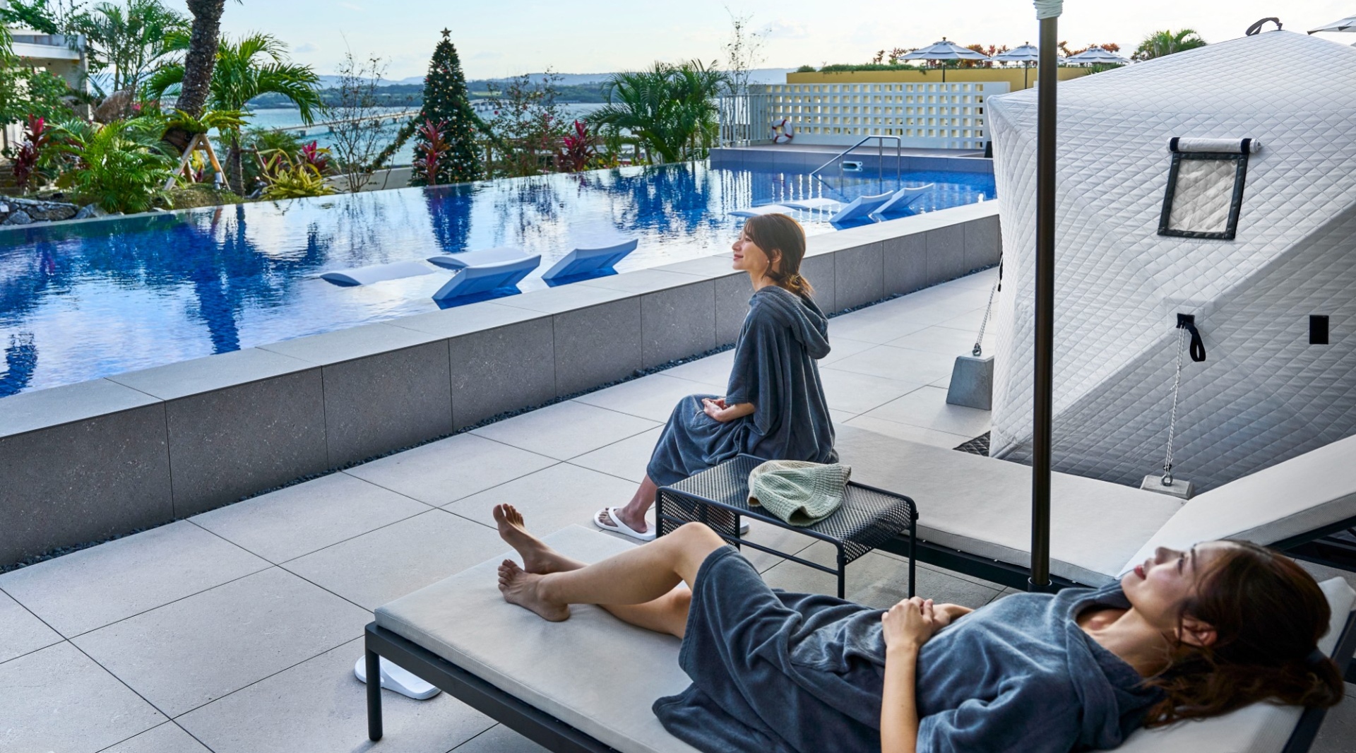 海に架かる古宇利大橋を眺めながらプールで過ごす
