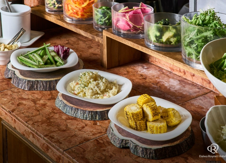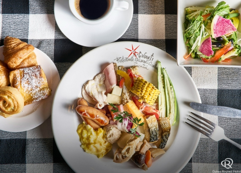 早上是日式西式的自助餐,中午是商务快餐,晚上可以悠然地享用葡萄酒和披萨等美食佳肴。