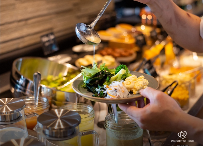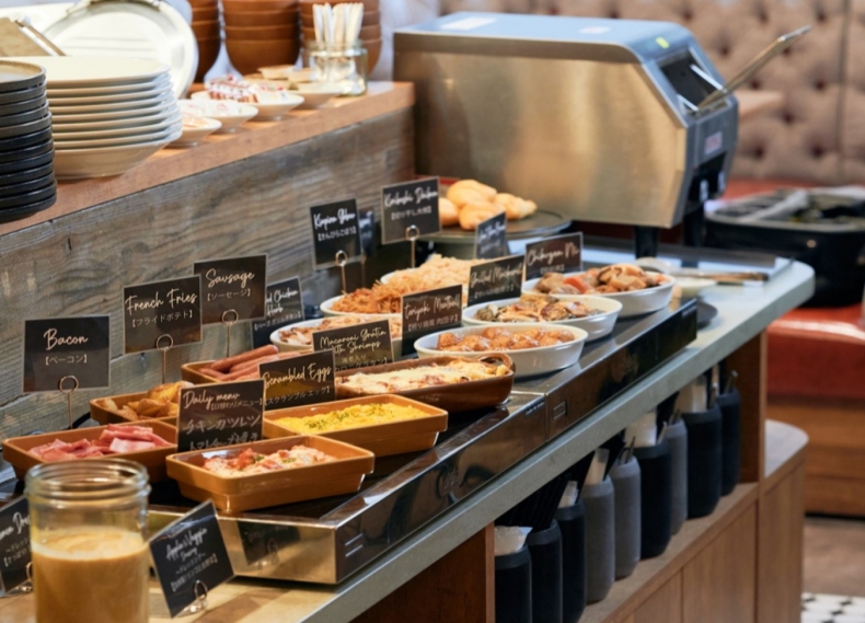 在以「和風摩登」為概念的餐廳「燈都」,品嚐種類豐盛的和洋折衷的自助餐形式的早餐。
