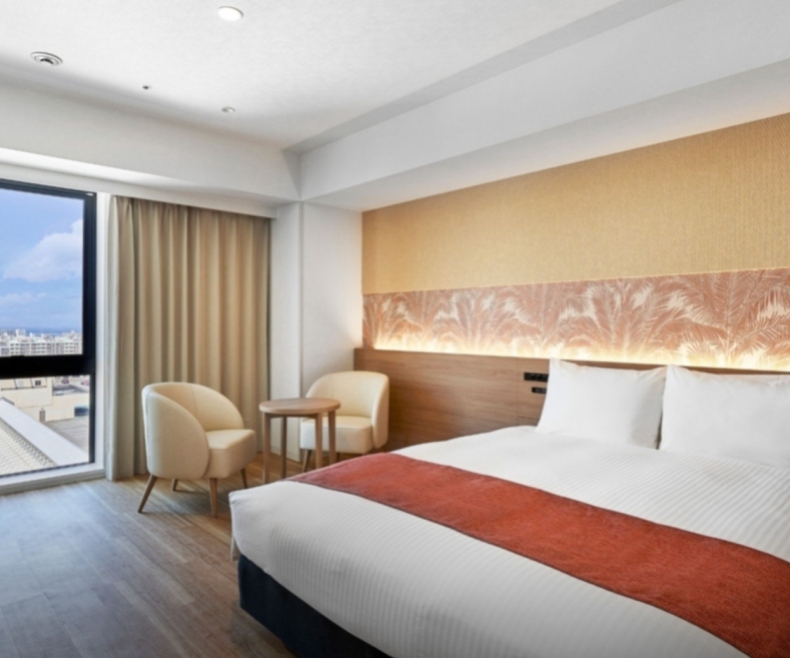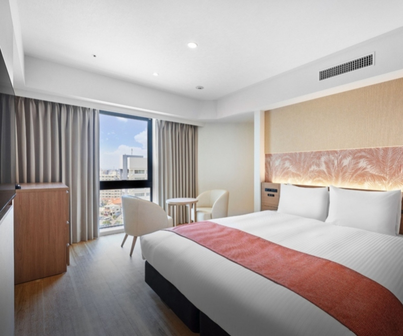客房採用三種會讓人聯想到沖繩的顏色,裡面融合了度假村的內裝與摩登時尚的都市飯店風格。
