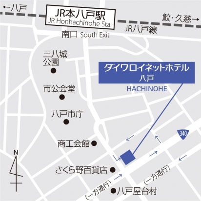 JR八戸線 本八戸駅南口より徒歩約10分、タクシーの場合約5分。