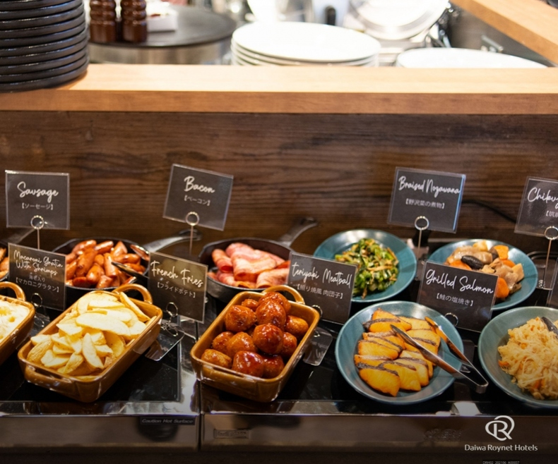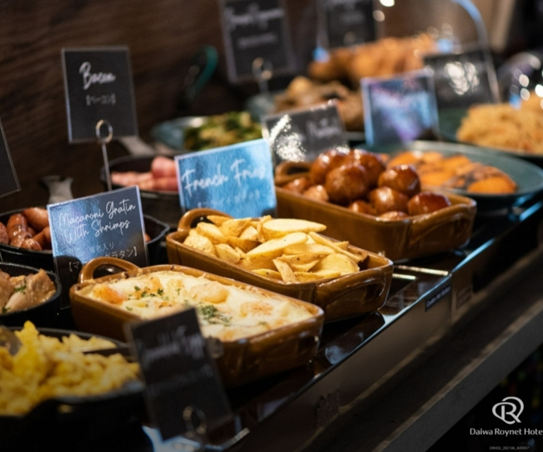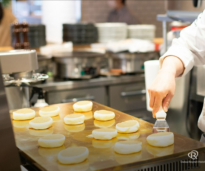 和洋ビュッフェの朝食をご提供させていただいております。おすすめの焼きたてのぷるふわパンケーキの食べ放題も含まれております。ぜひ自家製の塩キャラメルソースでお召し上がりください。