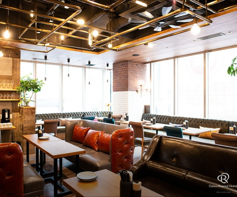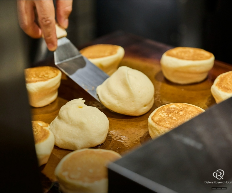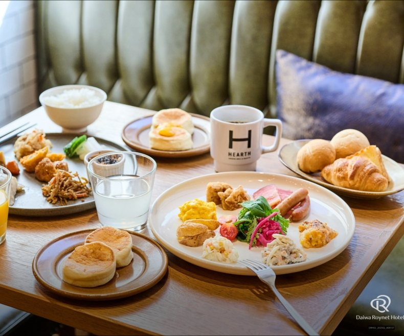 レストラン「HEARTH SMOKED GRILL & GALETTE」では、ホテルの朝食会場として和洋ビュッフェをご提供しております。焼きたてのぷるふわパンケーキは食べ放題でお楽しみいただけます。自家製の塩キャラメルソースもご用意しております。