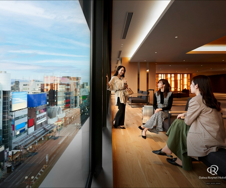 当館自慢の広々ロビー 大きな窓からは城山や電車通りが望めます。 御滞在中はご自由にお使いくださいませ。