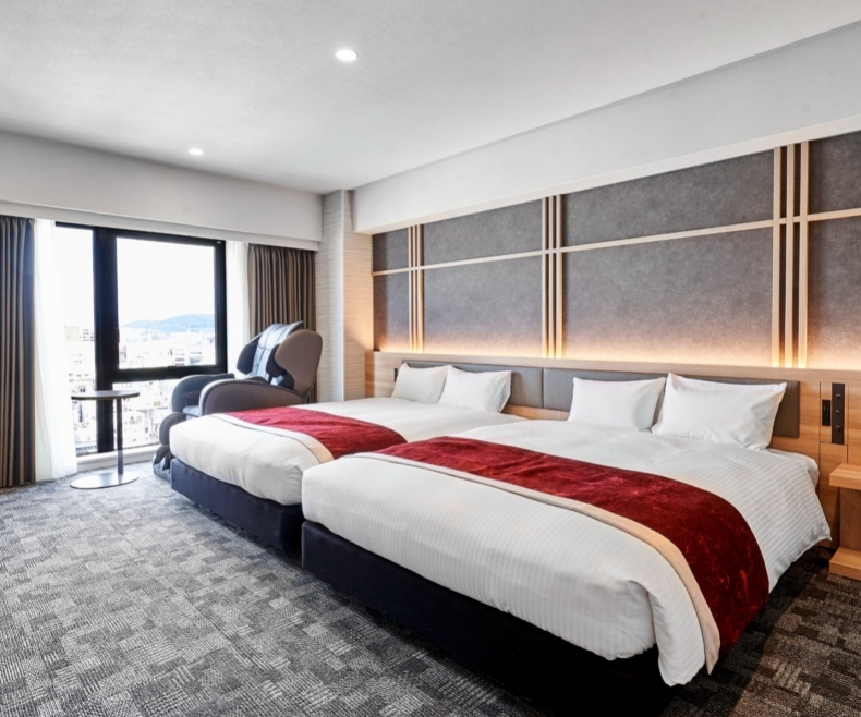 | 特徴 | 28㎡の広さで、バス・トイレは使い勝手の良いセミセパレート。 マッサージチェアでゆったりとお寛ぎいただけます。 ・49型液晶テレビ ・ベビーベッド設置可 ・マッサージチェア常設 |