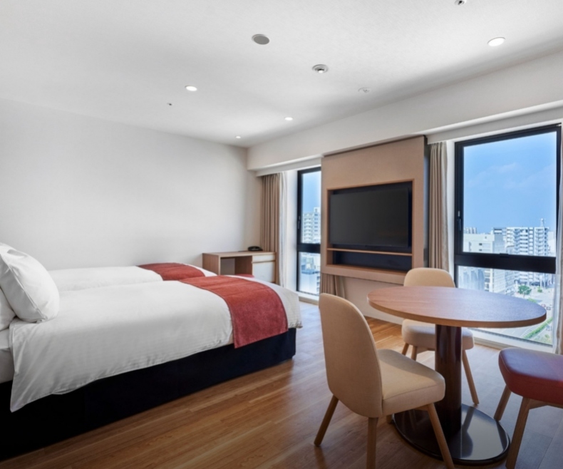 오키나와를 연상시키는 3개의 컬러의 방은, 리조트 인테리어와 모던하고 세련된 도시형 호텔의 믹스.