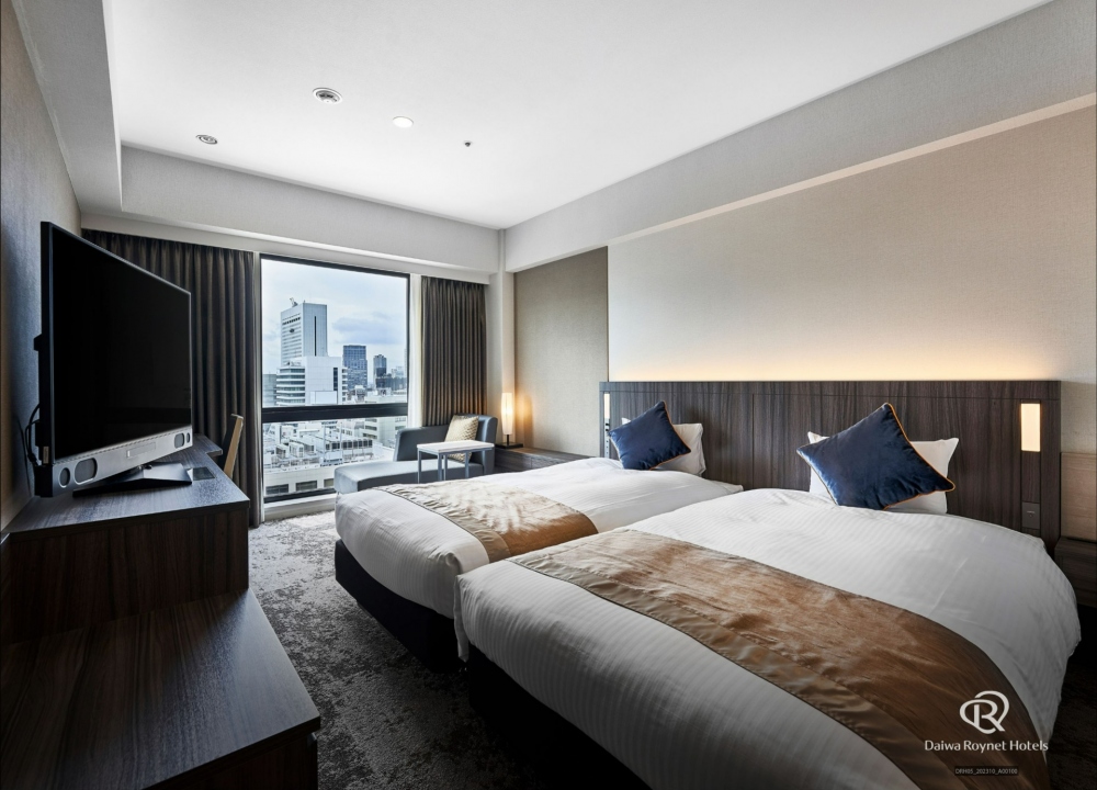 ・ 이타미 공항에서 리무진 버스로 오사카 역 앞 (우메다 역)까지 약 30분, 우메다 역에서 미도스지선 신사이바시 역까지 약 10분, 하차 후 도보 약 3분