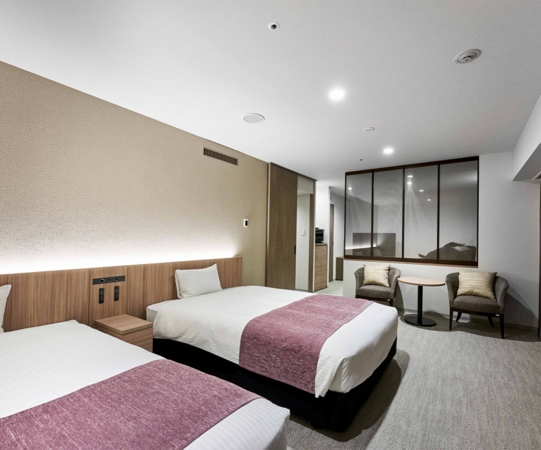 전 객실을 18㎡ 이상으로 여유롭게 설계. 여행 캐리어를 놓아도 여유 있는 공간을 확보했습니다.