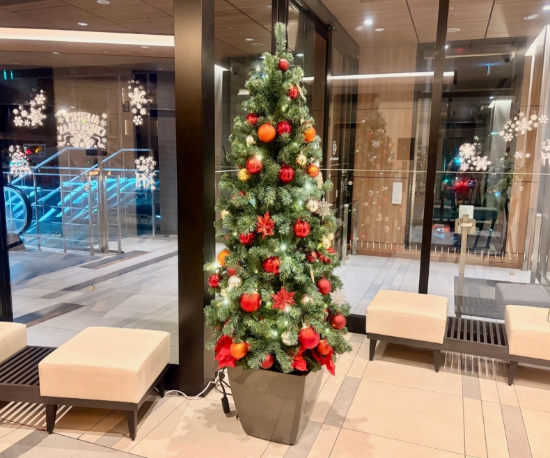 ロビーにはクリスマスツリーが優しく灯り、窓ガラスは雪のデコレーションで華やかな雰囲気に。