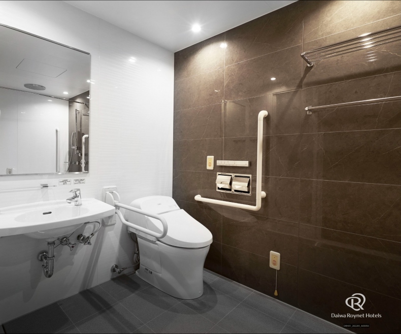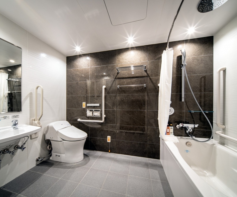 ユニバーサルルームを除く全てのお部屋に、セミセパレートタイプのバスルーム、オーバーヘッドシャワー完備。