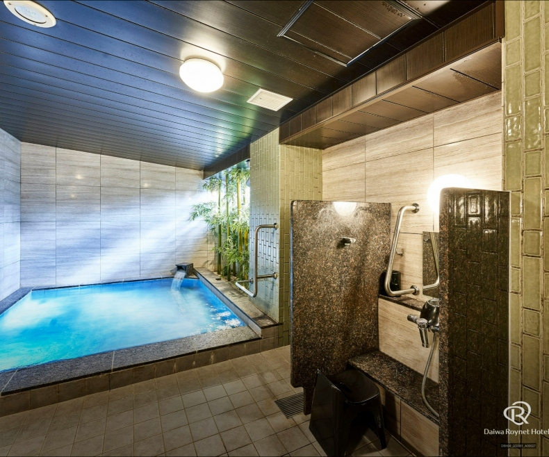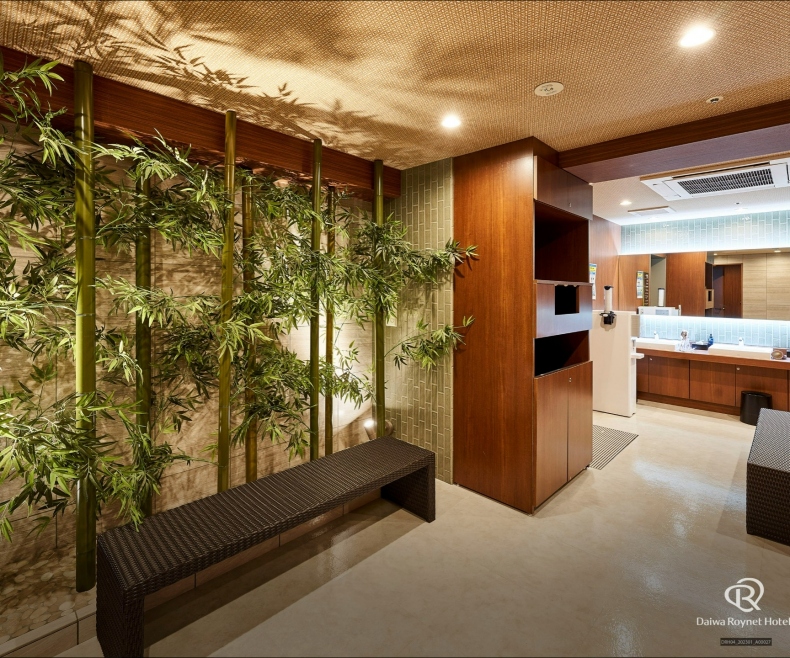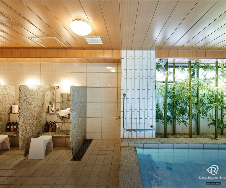 男性浴場:ブラウンを基調とした、竹林をイメージした壁面アートに囲まれた浴槽は、落ち着いた空間を創り出しています。