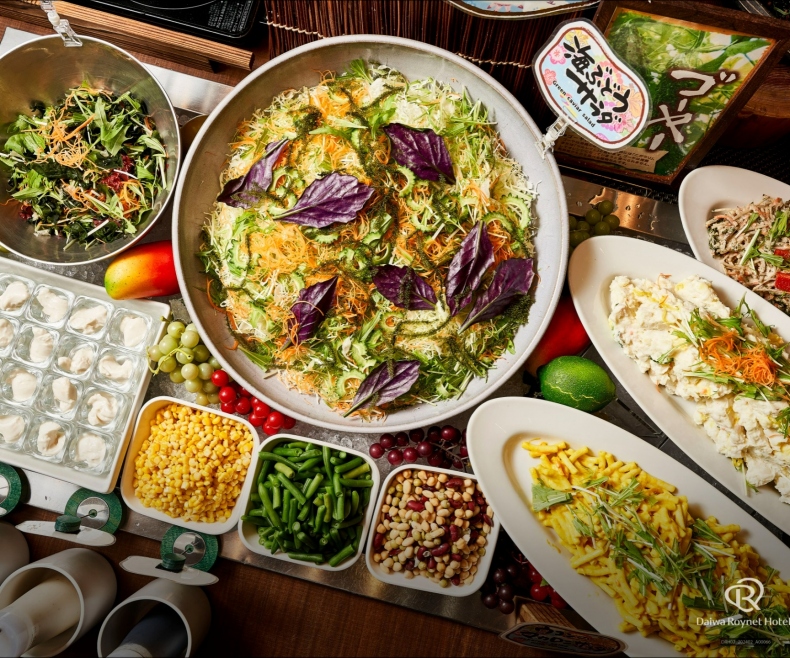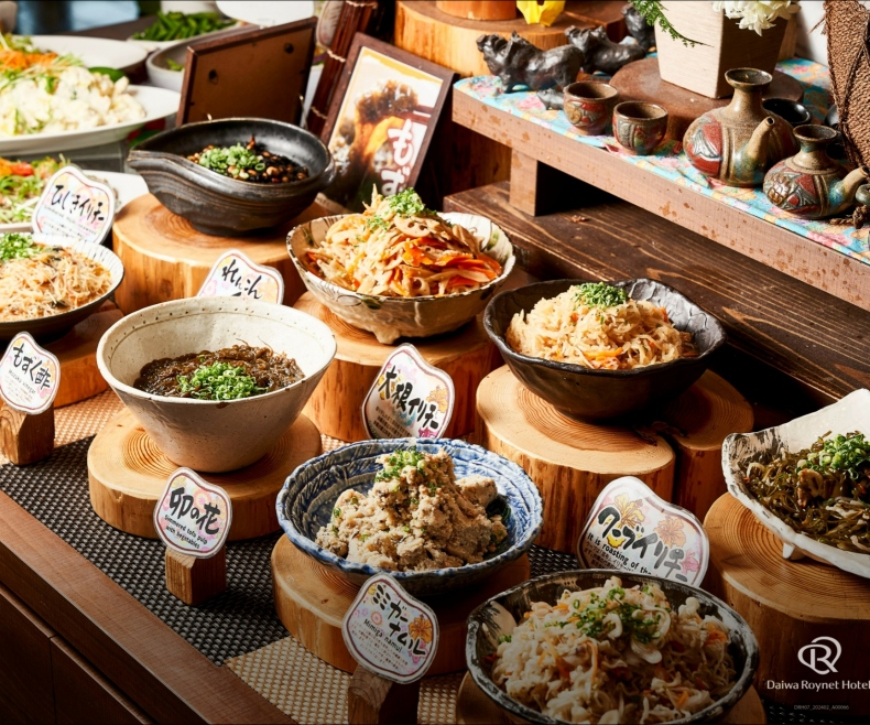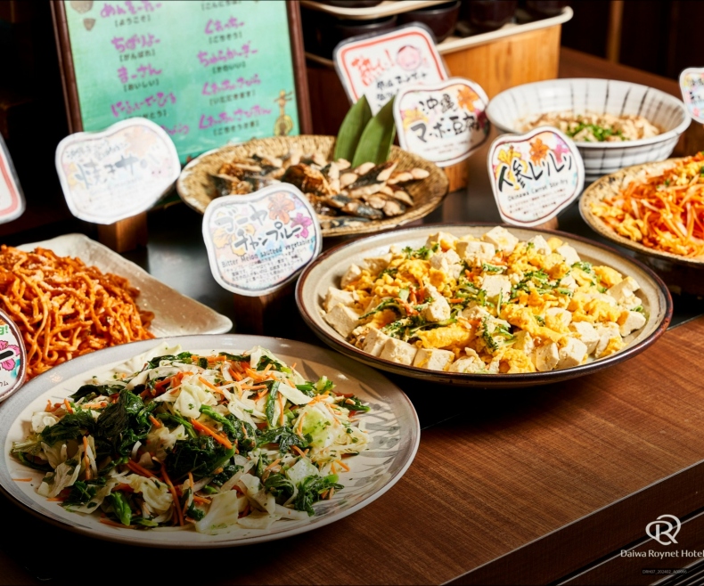 長寿の県沖縄の食材をメインで使った体にやさしいお料理が50種類以上並びます。