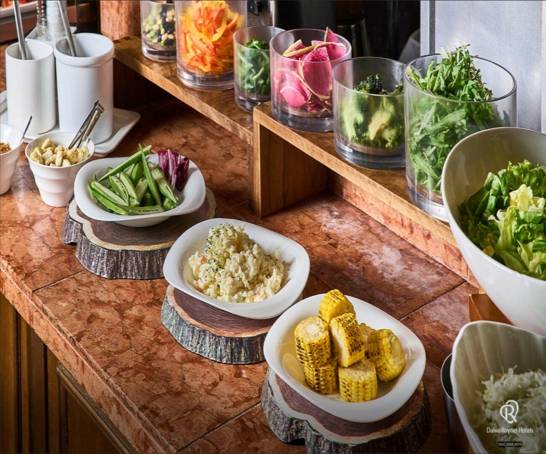 そこから一歩外れた所、ホテル内とはいえ、森のような木々が見えるガラス張りのお店は、 朝はホテルの和洋ビュッフェ、昼はビジネスランチ、夜はゆっくりとワインやピザなどを気楽に味わうことができます。