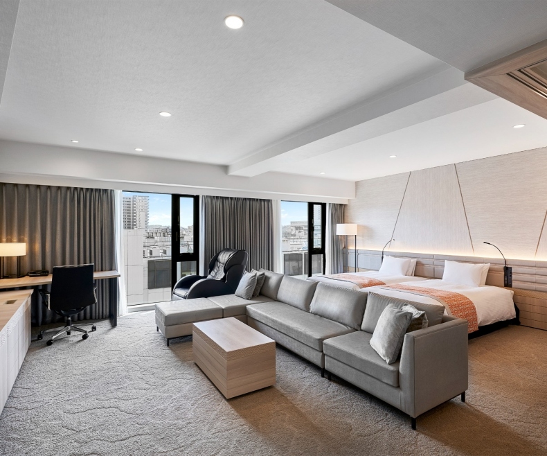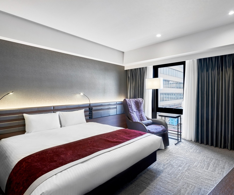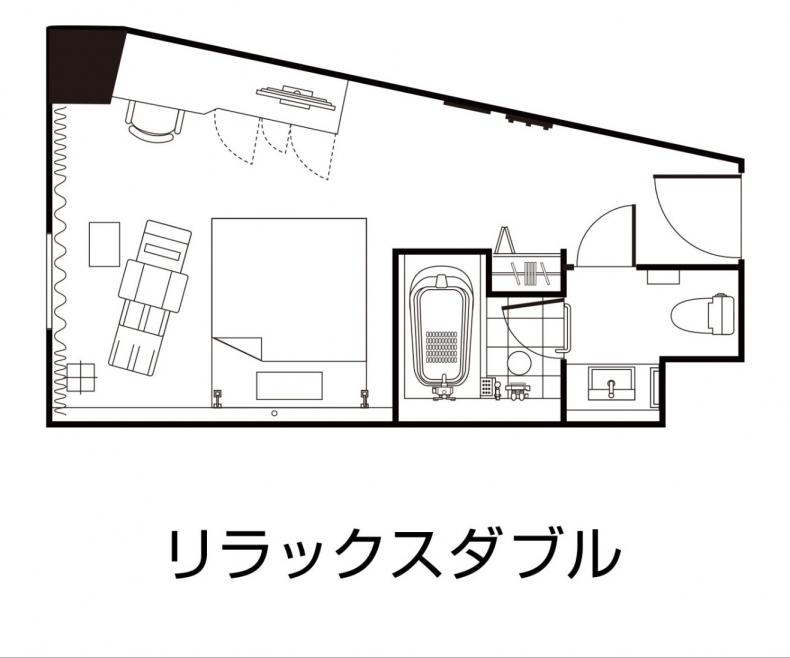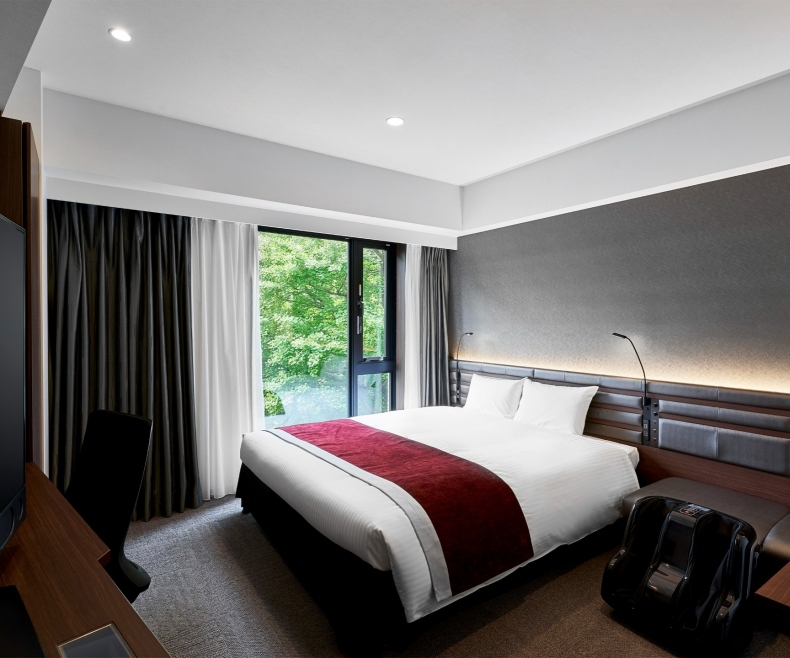 | 特徴 | こちらのお部屋タイプはマッサージチェアを常設しております。 1日の疲れをマッサージチェアで癒してみてはいかがでしょうか。 また、ベッド幅も非常に広く、テレビのサイズも50インチのものを採用しております。 至極のひと時をお過ごしくださいませ。 ※リラックスダブルは全室側道に面したお部屋です。広瀬通には面しておりません。 ※リラックスダブルは全室消防侵入口の為、窓は外からの開閉のみとなります。客室内から窓の開閉は出来かねます。 |