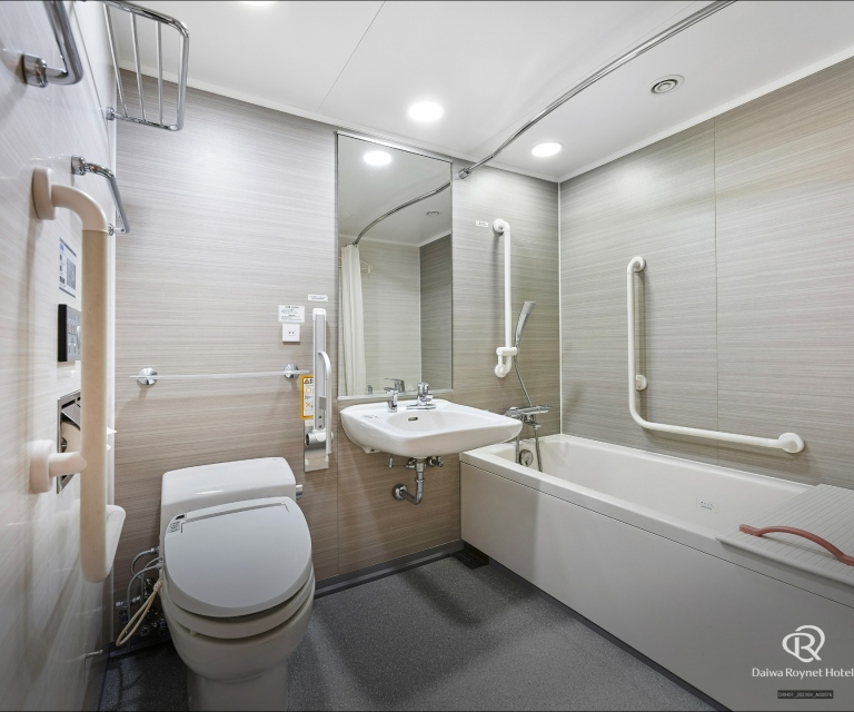 手すりが各所についている、ユニットバス形式のバスルームです。