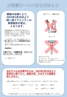 【ご案内】韓国の法律により「使い捨てアメニティの無償提供が禁止」となります。